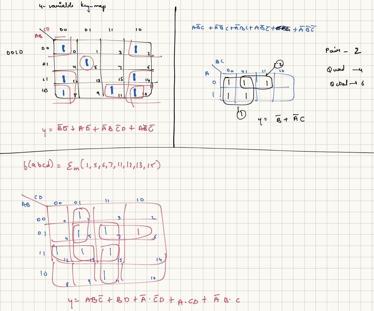 When making a group, look at the constant values in all the cells in the group for each variable. If one variable changes (0 and 1), ignore it; if it stays constant, include it in the term.